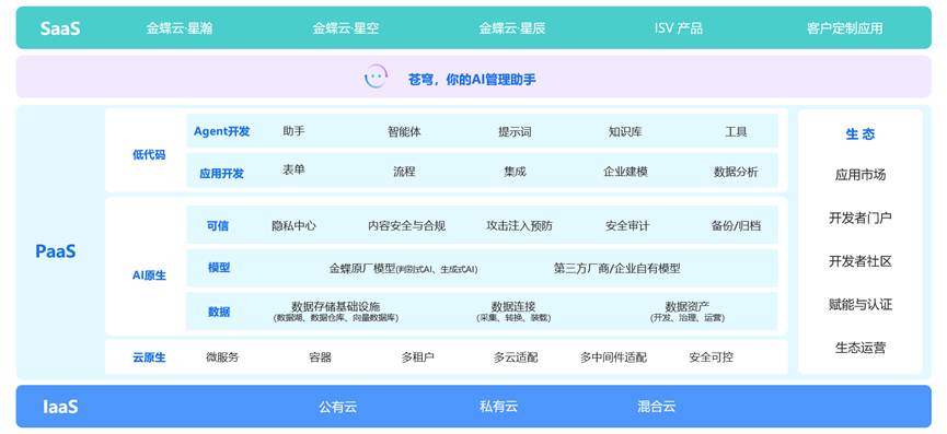 正是在这样的转型需求下,金蝶云·苍穹升级为新一代企业级AI平台,依托先进的云原生和 AI 原生技术,精心构建起涵盖技术、数据、模型、可信的全方位能力体系,以低代码的高生产力套件作为核心驱动力,以 AI 管理助手作为智能中枢,助力企业构建更敏捷高效、更稳定可靠、更智能先进以及更开放多元的数智化核心能力,有力推动企业实现智能化变革和高质量发展。